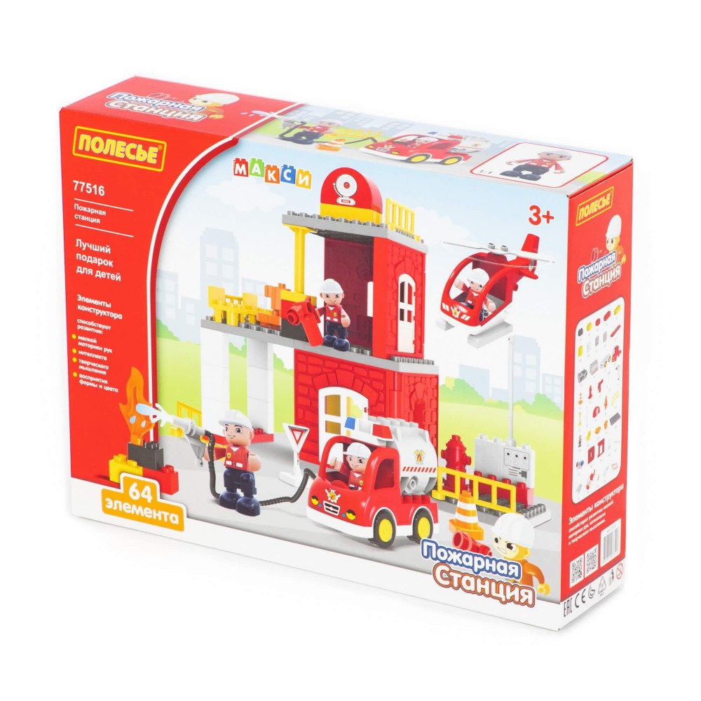 Конструктор "Макси" - "Пожарная станция" познакомит малыша с увлекательной профессией спасателей-пожарных, позволяя придумывать различные игровые сценарии. В набор входит 64 элемента конструктора.