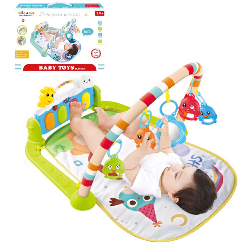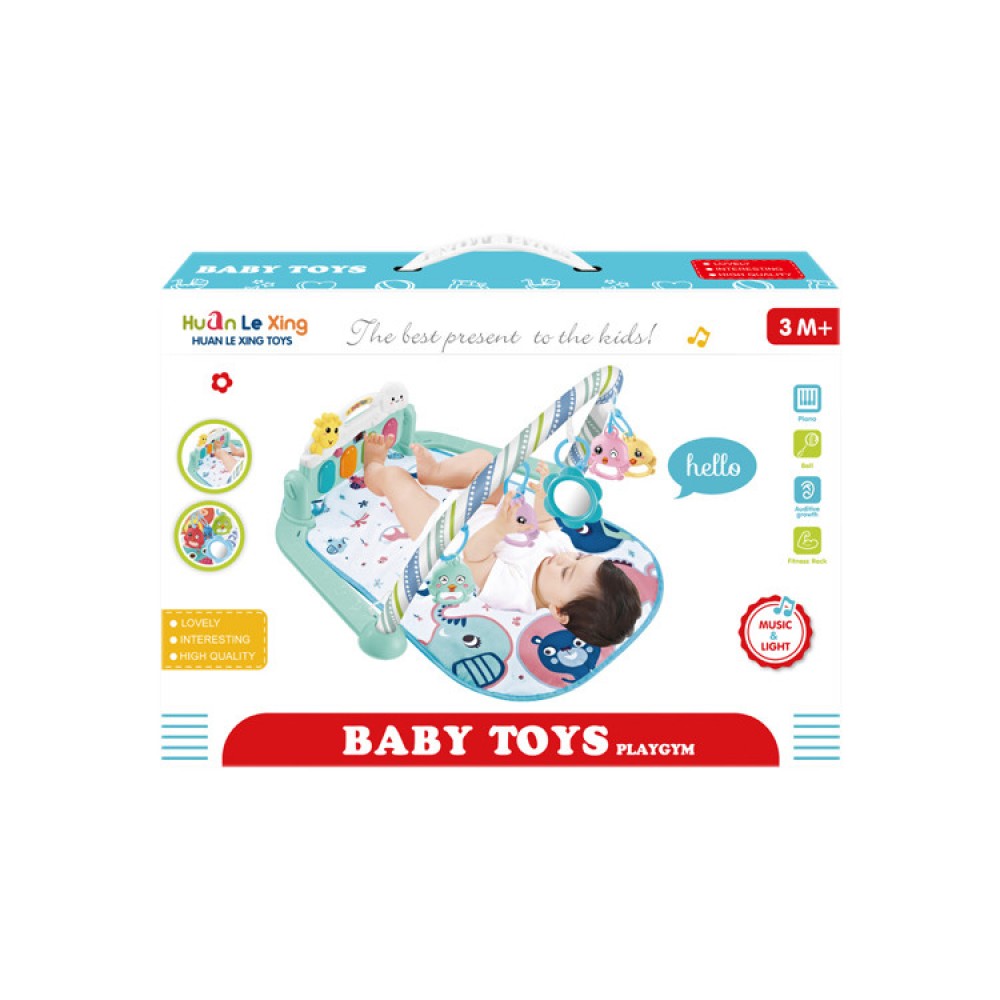 Набор состоит из мягкого коврика с милым рисунком, детское пианино, которое крепится к конструкции и мягкая дуга с разными очаровательными погремушками.